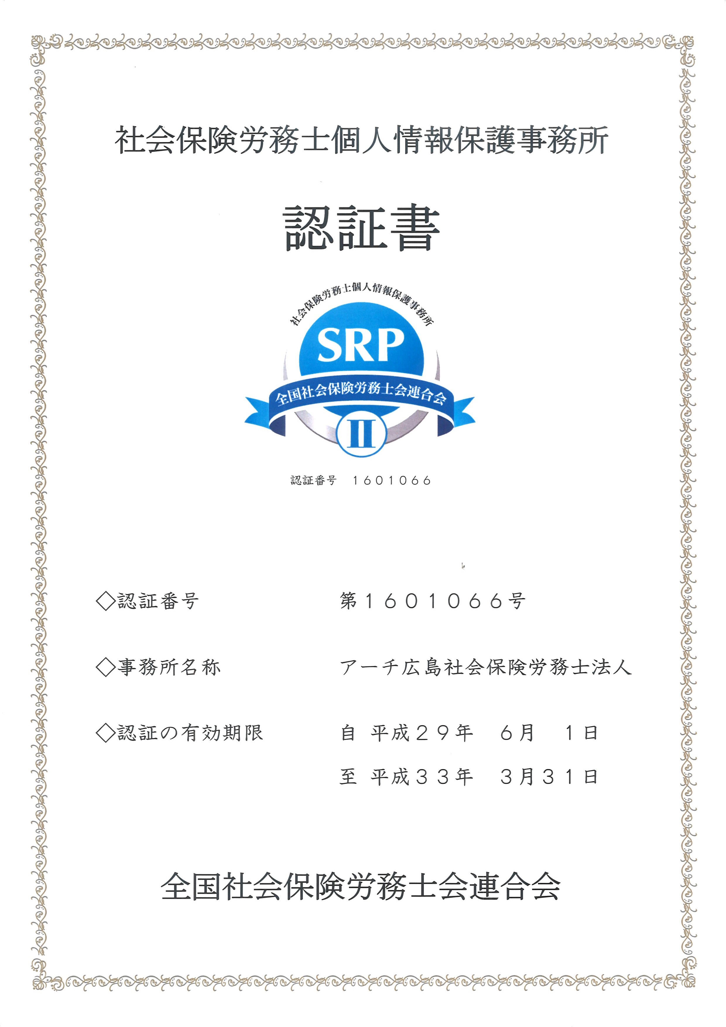 | 平成20年より、社会保険労務士の全国組織である社会保険労務士連合会が、社会保険労務士独自の個人情報の保護制度として、その信用と信頼を担保する仕組みとしてSRP認証制度を創設いたしました。当事務所はそのSRP認証の認証事務所(第398号)として認証を受けたものです。 |