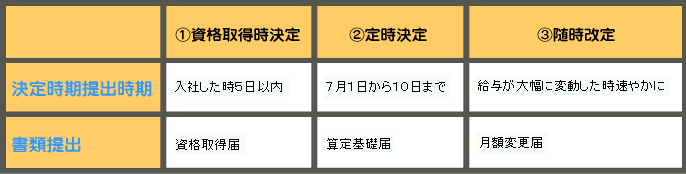 各人の社会保険料の決定は通常以下の3つの時期に決定され、それぞれ社会保険事務所への提出書類も異なります。 その中でも③の随時改定は届出がもれる可能性が高いので注意が必要です。