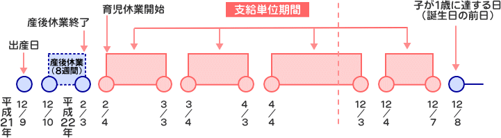 2.育児休業給付金の支給を受けるためには、1.の手続き後、事業主を通じて2か月に1回支給申請していただく必要があります。なお、女性の被保険 者の場合、育児をしている子についての産後休業8週間については、育児休業期間には含まれませんので注意が必要です。また、支給申請書の提