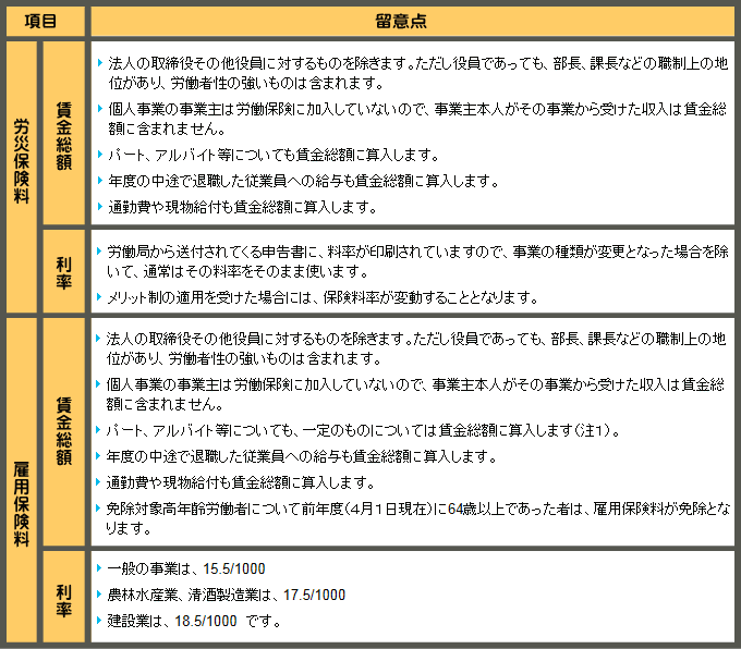 前年度分の確定保険料は、労災保険料と雇用保険料の合算額です。労災保険料と雇用保険料は、それぞれ賃金総額に 料率を乗じて算定します。賃金総額と料率の計算上の留意点は次のとおりです。