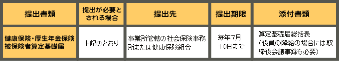 算定基礎届は、毎年7月10日までに、所轄社会保険事務所(健康保険組合に加入している場合には健康保険組合にも)に 提出する必要があります。